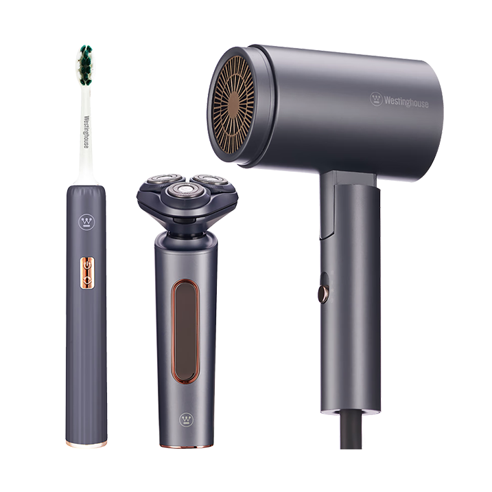 【电动牙刷+剃须刀+电吹风】套装 电吹风:千万级负离子、三档温度调节; 电动牙刷:3D立体软刷毛、5档美牙模式 剃须刀:双环平面刀网、浮动贴面剃须系统
