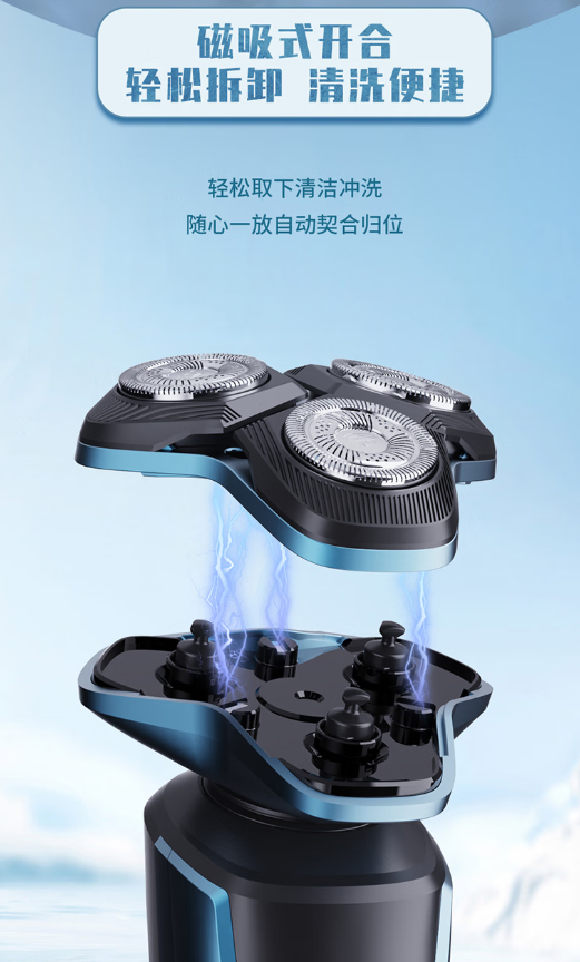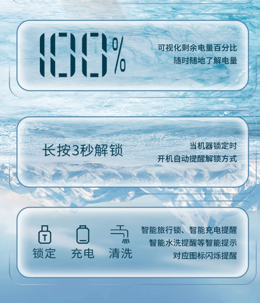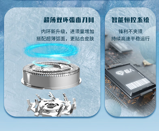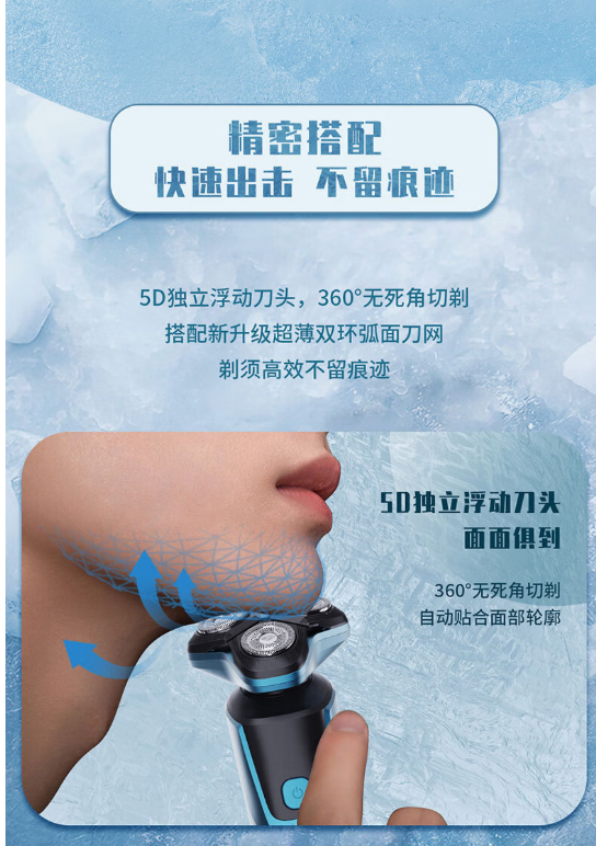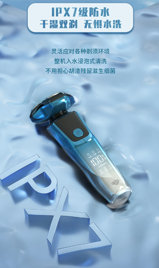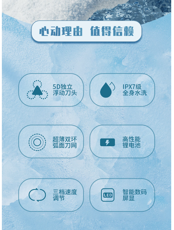 5D独立浮动刀头;IPX7级全身水洗;超薄双环弧面刀网;高性能锂电池;三档速度调节;智能数码屏显。