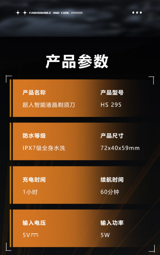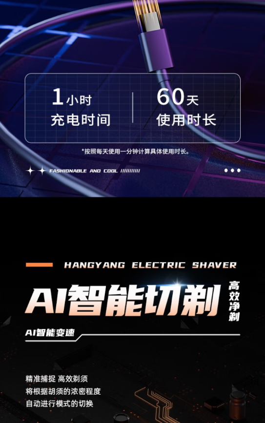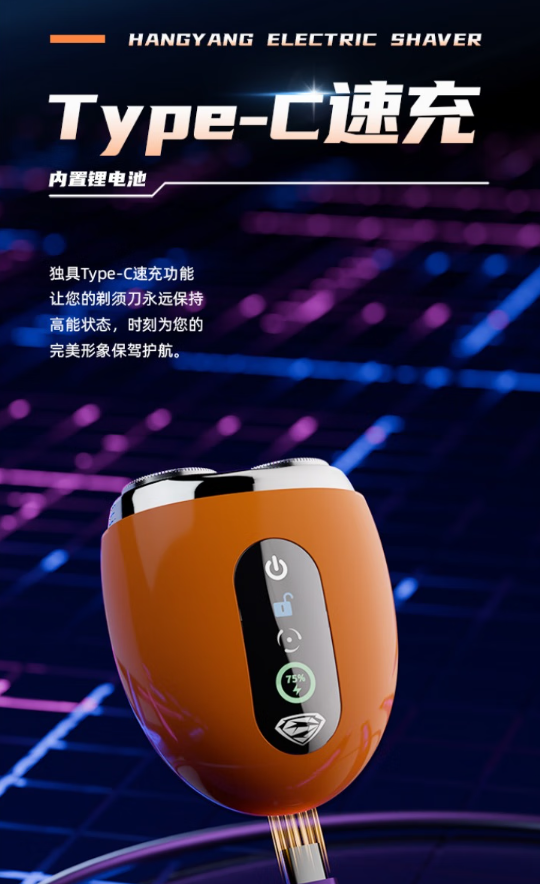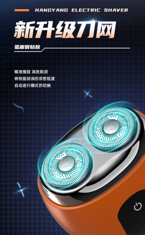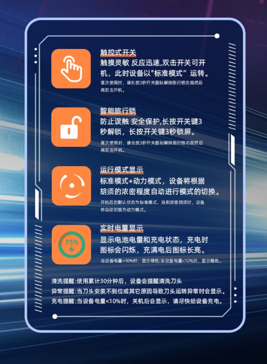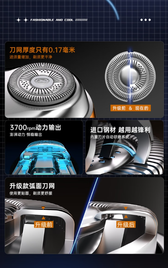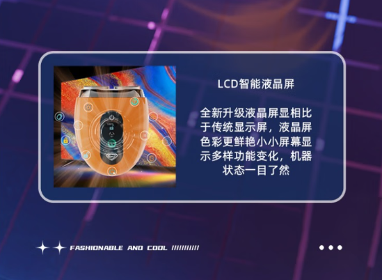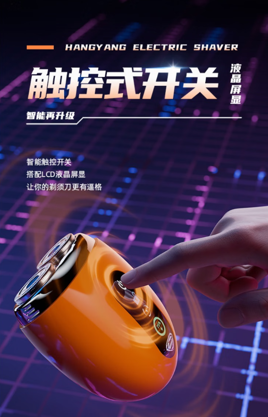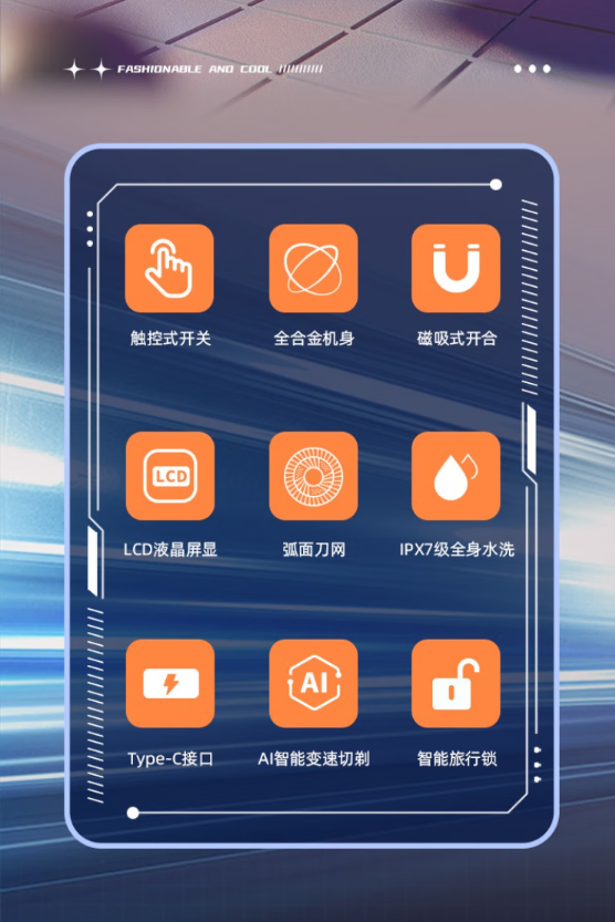 触控式开关;全合金机身;磁吸式开合;LCD液晶屏显;弧面刀网;IPX7级全身水洗;Type-C接口;AI智能变速切剃;智能旅行锁。