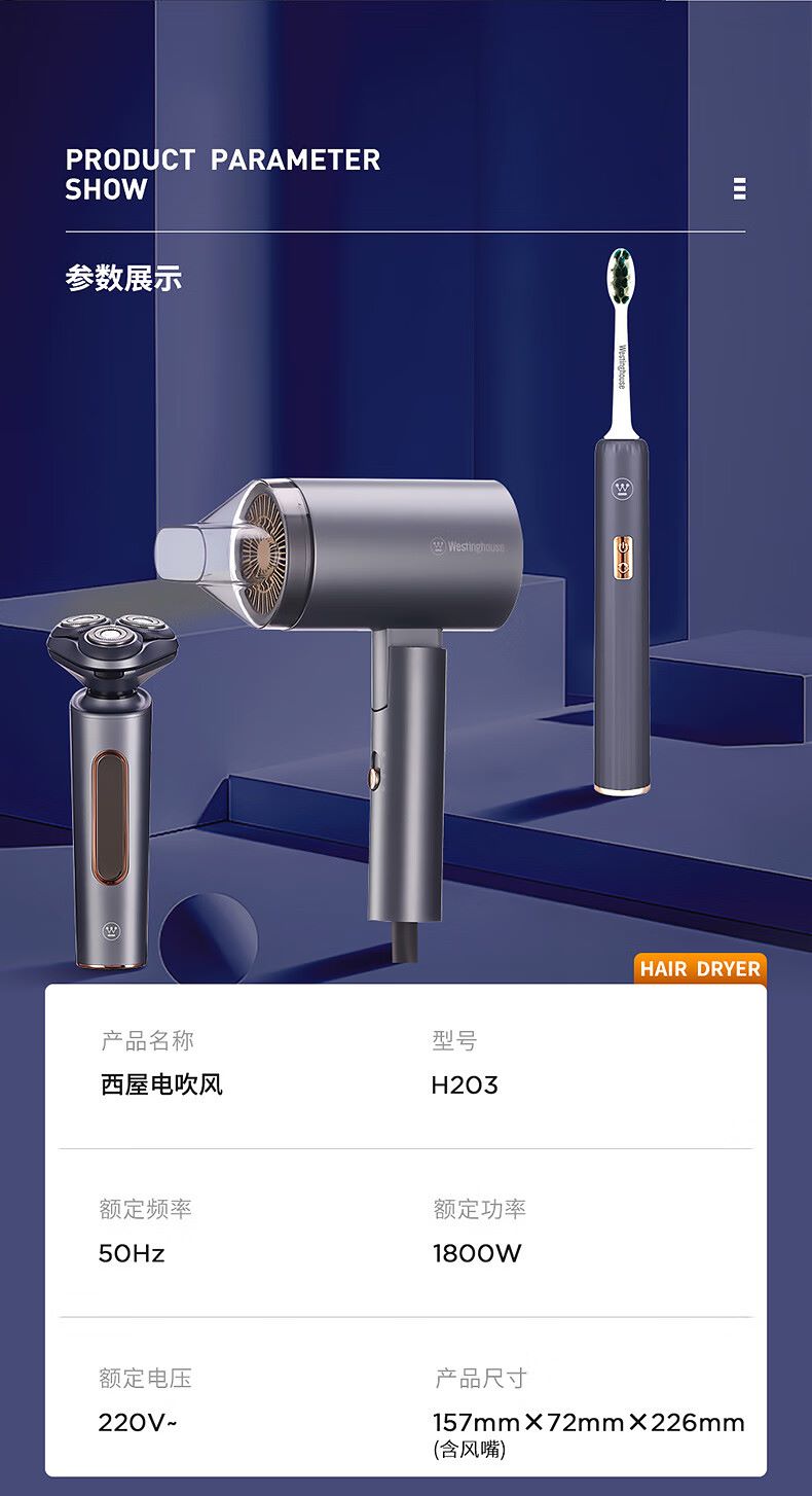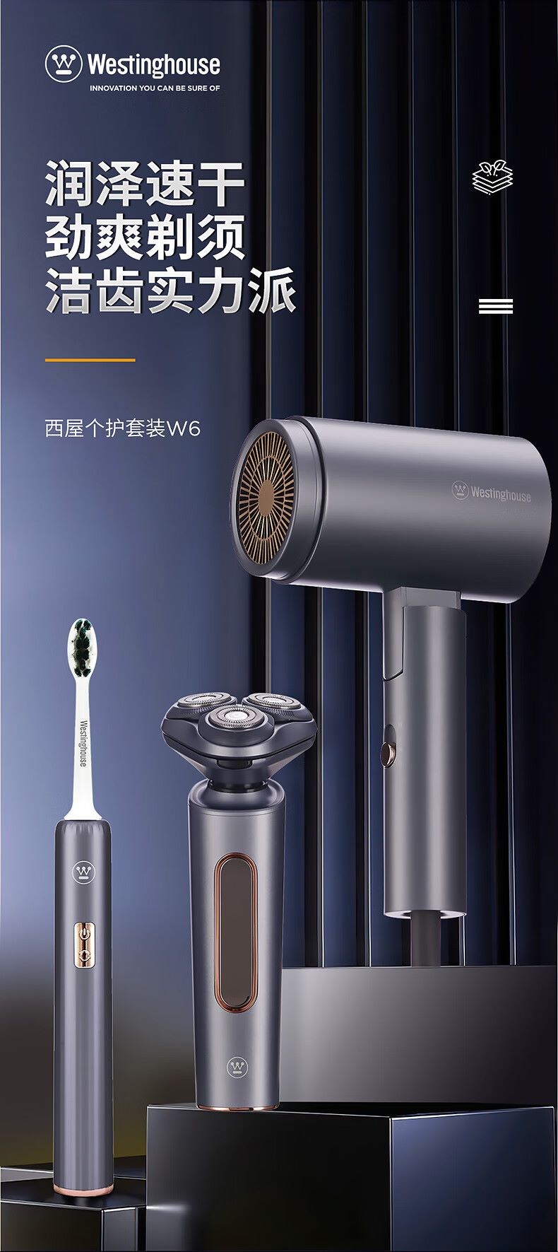【电动牙刷+剃须刀+电吹风】套装 电吹风:千万级负离子、三档温度调节; 电动牙刷:3D立体软刷毛、5档美牙模式 剃须刀:双环平面刀网、浮动贴面剃须系统