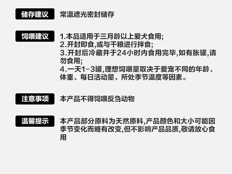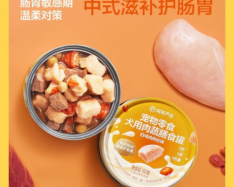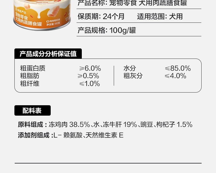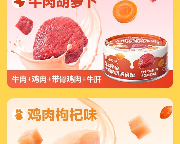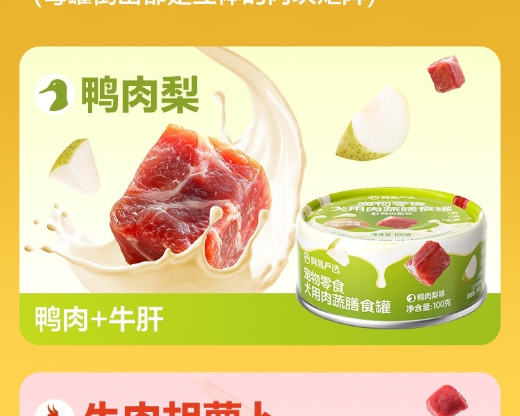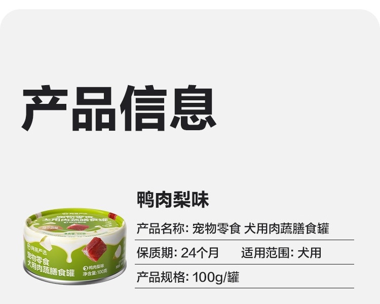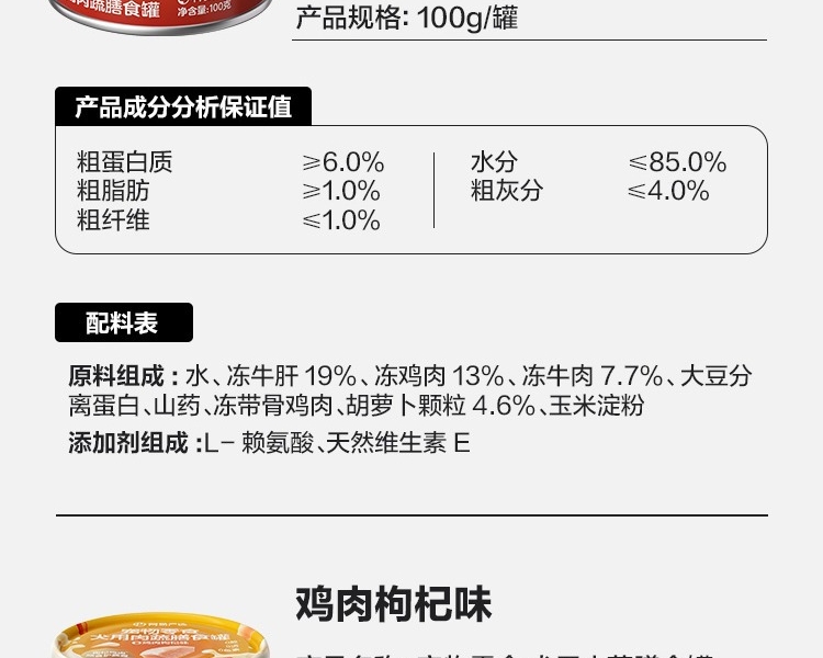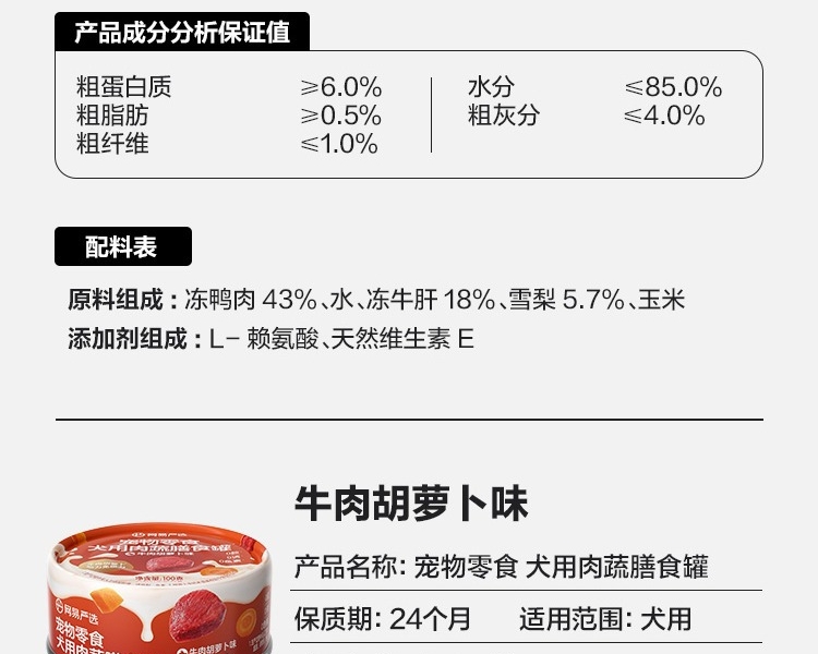 鸭肉梨味 100g*12罐 牛肉胡萝卜味 100g*12罐 鸡肉枸杞味 100g*12罐 |
